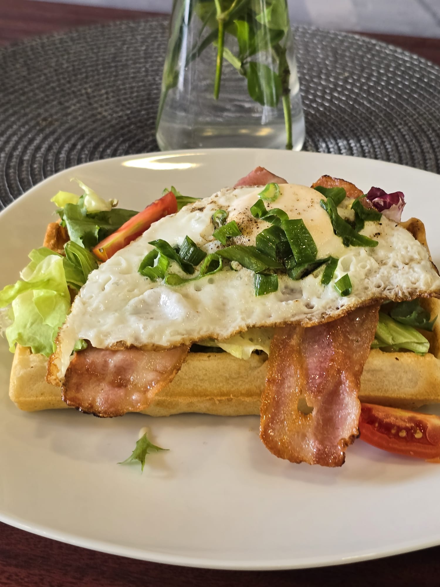GOFR WYTRAWNY – chrupiący gofr wytrawny, jajecznica, jajko sadzone lub twarożek, bekon, sałatka